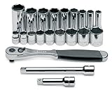 - Includes: 1 ratchet, 2 extensions, 9 standard sockets from 3/8" - 7/8", 9 deep well sockets from 3/8" - 7/8" and a zipppered canvas storage pouch.